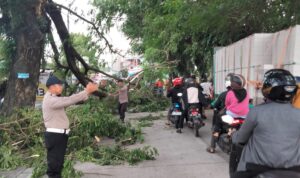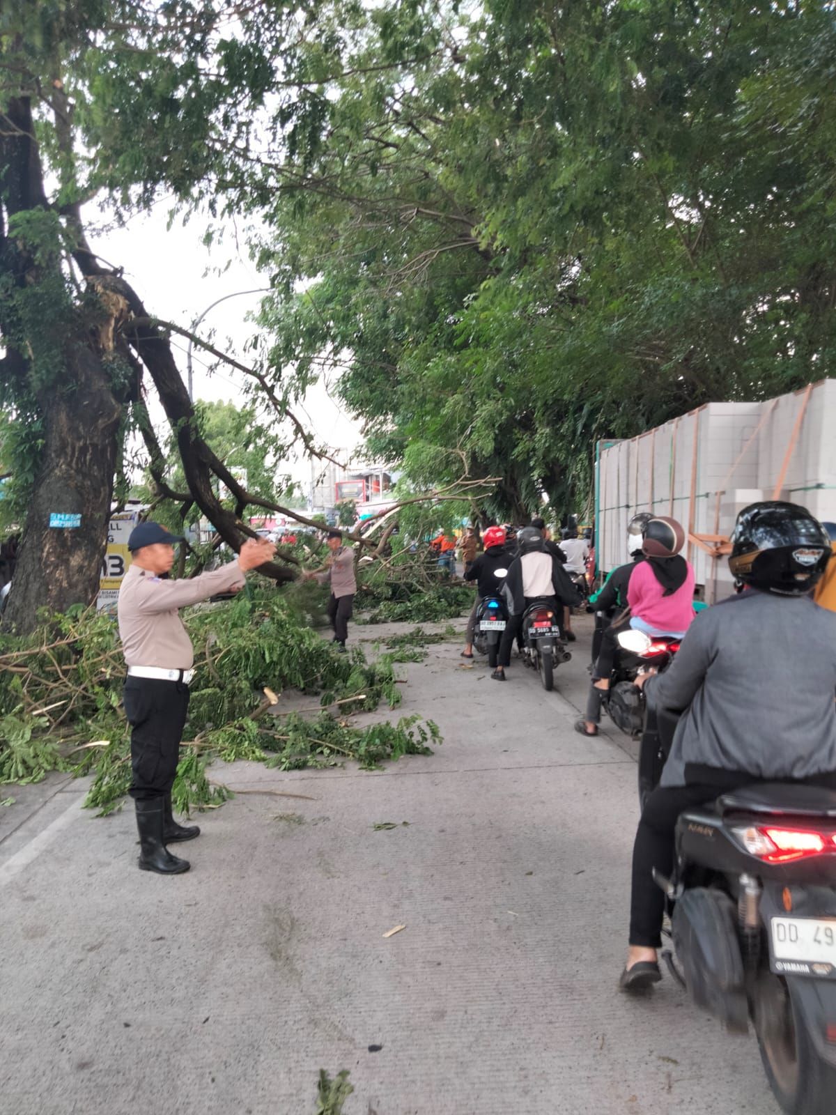 Personil Polsek Manggala dipimpin Kanit Lantas Iptu Bakri serta personil Bhabinkamtibmas Aipda Arham diwilayah bersama warga sekitar dengan menggunakan alat seadanya berusaha evakuasi pohon tumbang yang menutup akses jalan sembari menunggu dari dinas lingkungan hidup kota makassar serta tim kebersihan dari kecamatan