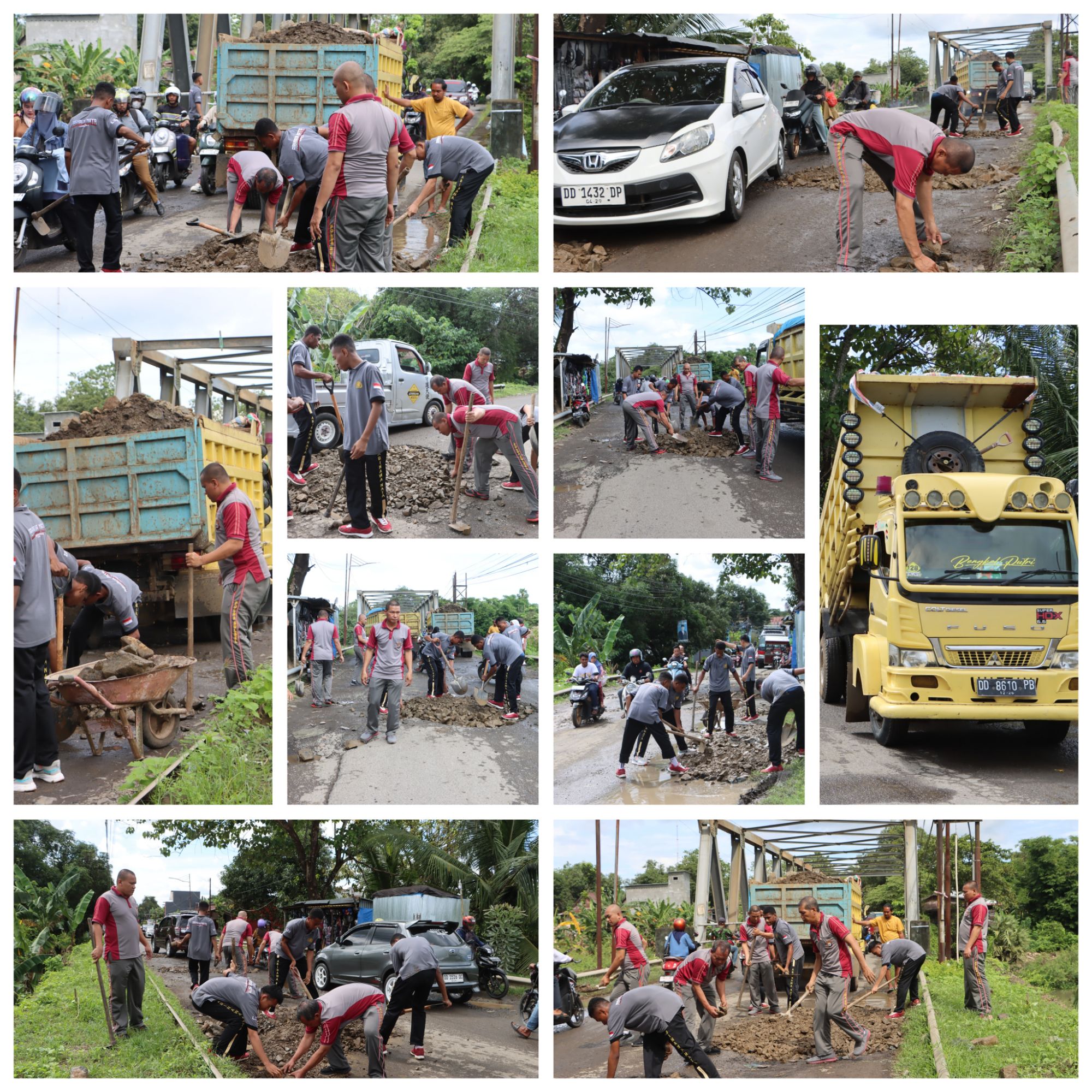 Tindakan ini diambil setelah banyaknya laporan dari masyarakat tentang kondisi jalan yang membahayakan pengendara, terutama roda dua. Sebagai bentuk kepedulian terhadap keselamatan pengguna jalan, Kasat Binmas bersama beberapa anggota Polres Takalar dan warga sekitar bergotong royong menutup lubang di jalan yang rusak dengan material seadanya.