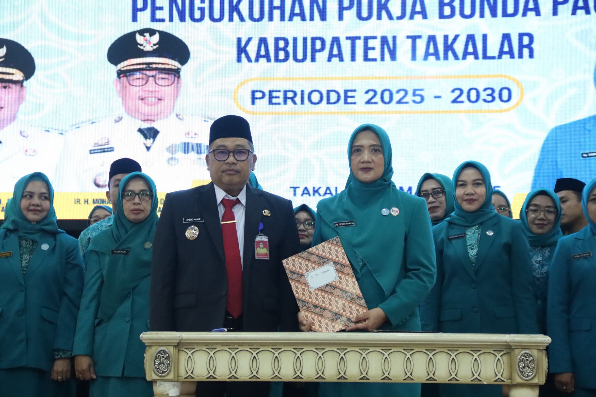 Proses pelantikan Pengurus PKK Kab. Takalar Masa Bakti 2025-2030 dirangkaian dengan Pengukuhan Pokja Bunda PAUD Kab. Takalar berlangsung di Ruang Pola Kantor Bupati Takalar.
