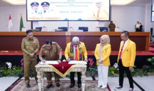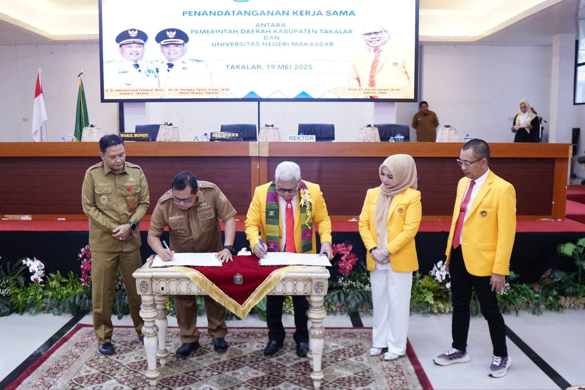 Bupati Takalar Ir. H. Mohammad Firdaus Daeng Manye,.MM didampingi Wakil Bupati Takalar Dr. H. Hengky Yasin,.S.Sos,.MM melakukan Penandatangan Kerjasama dengan Universitas Negeri Makassar (UNM) di Ruang Pola Kantor Bupati Takalar, Senin 19 Mei 2025.