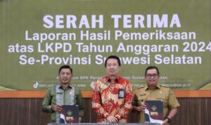 Penyerahan laporan hasil pemeriksaan atas Laporan Keuangan Pemerintah Daerah (LKPD) se-Sulawesi Selatan berlangsung di Auditorium BPK RI Perwakilan Sulsel, Jalan AP Pettarani, Selasa 27 Mei 2025.