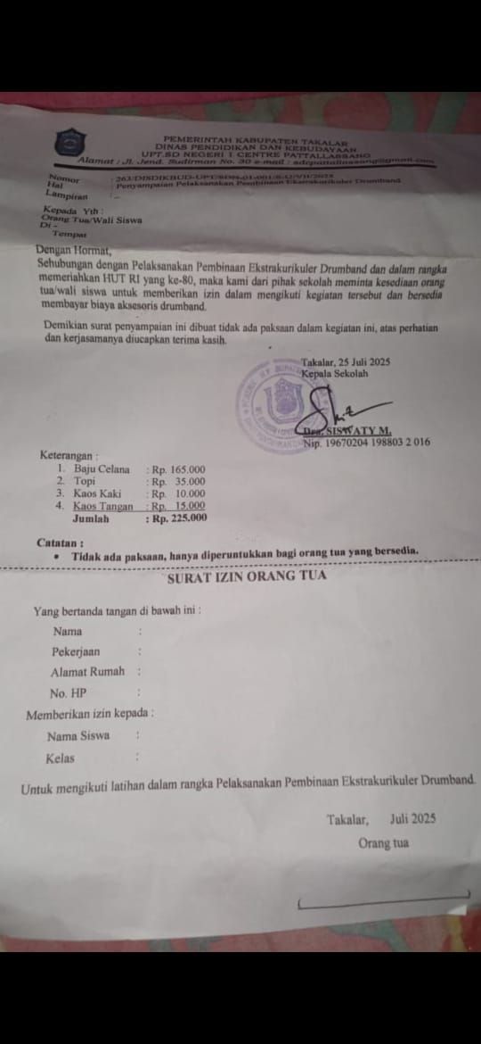 🇮🇩 Cakar Elang.id 🇮🇩 ~ Takalar – Miris dirasakan sejumlah orang tua siswa SD Centre Negeri 1 Centre Pattallassang, Kecamatan Pattallassang, Kabupaten Takalar, saat menerima pemberitahuan tentang pungutan sebesar Rp225.000 per siswa yang diminta pihak sekolah. Dana tersebut ditujukan untuk pembelian pakaian dan celana seragam drumbend guna mengikuti pawai kemerdekaan pada 17 Agustus 2025. Kebijakan ini sontak memicu keluhan, khususnya dari orang tua yang berasal dari keluarga kurang mampu.