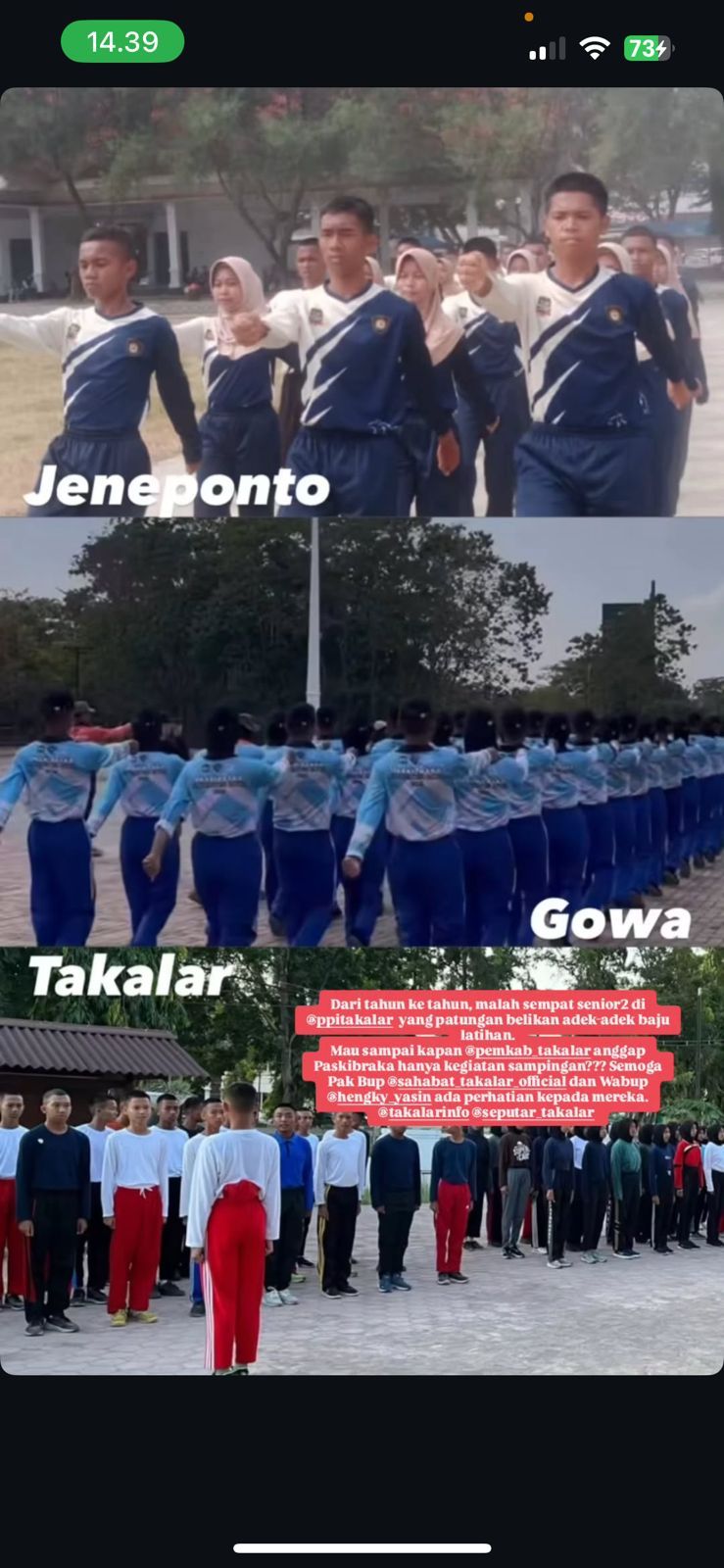 Sementara Gowa datang dengan tim yang seragam dari kepala hingga kaki—kompak, baru, dan terkoordinasi—dan Jeneponto tak kalah cemerlang dengan fasilitas pendukung lengkap, Takalar justru tampil seperti anak tiri yang ditinggal zaman. Ada anggota Paskibraka yang mengaku harus meminjam sepatu, bahkan menyetrika sendiri seragam yang mulai kusam karena tidak disediakan pengganti oleh dinas terkait. Ini bukan sekadar soal estetika, tapi soal penghargaan terhadap jerih payah dan semangat anak bangsa.