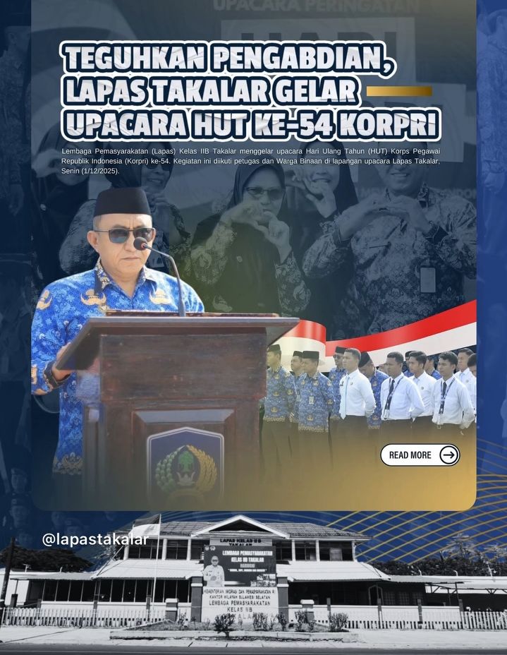 Kebersamaan keduanya terlihat nyata ketika memimpin pelaksanaan upacara Hari Korpri yang ke-54 di halaman kantor Lapas Takalar. Dengan formasi yang rapi dan suasana yang penuh khidmat, upacara tersebut menjadi simbol harmoninya hubungan kerja antara pimpinan dan staf. Momen itu memperlihatkan bahwa disiplin dan kekompakan bukan sekadar slogan, tetapi dijalankan secara konsisten dalam setiap aktivitas kedinasan.