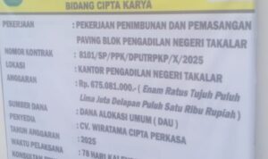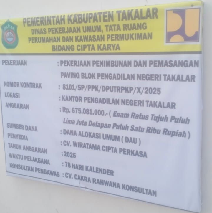 Cakar Elang.id ~ Takalar–Proyek penimbunan dan pemasangan paving block di kantor Pengadilan Negri Takalar,Kabupaten Takalar, Provinsi Sulawesi Selatan, Nomor Kontrak 8101/SP/PPK/DPUTRRKP/X/2025 Dengan Nilai anggaran Rp 675.081.000, .(Enam Ratus Tujuh Puluh Lima juta Delapan Puluh Satu Ribu), Sumber dana alokasi umum(DAU), yang di kerjakan oleh CV.Wiratama Cipta Perkasa dengan jenjang waktu pekerjaan 78 Hari, yang diduga tidak sesuai dengan bestek dan parahnya kegiatan tersebut menggunakan material tanah timbun ilegal,.kamis(09/12/25)