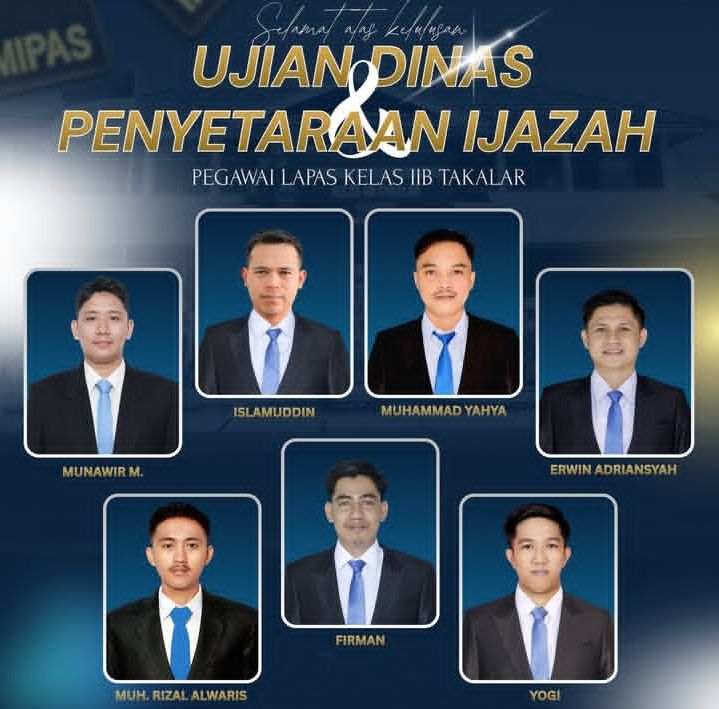 Kalapas Takalar menambahkan bahwa ujian dinas dan penyetaraan ijazah bukan hanya soal formalitas, tetapi merupakan upaya untuk meningkatkan kompetensi dan kualitas layanan, sehingga setiap pegawai dapat memberikan kontribusi yang lebih besar dalam menjalankan visi dan misi lembaga pemasyarakatan. Ia berharap, pencapaian ini dapat menjadi titik awal bagi perjalanan yang lebih gemilang dalam pengembangan karir dan pengabdian kepada negara.